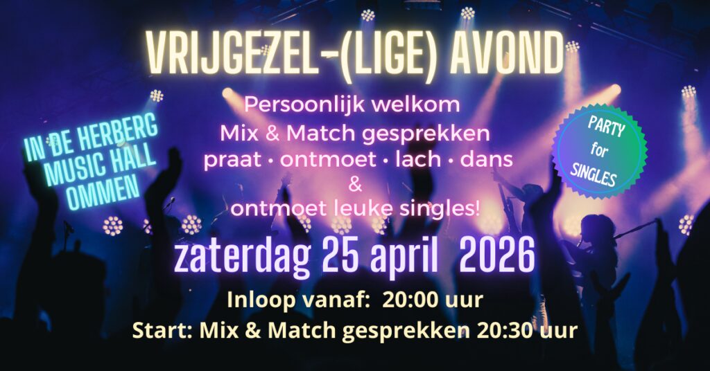 https://vrijgezel-lige-avond.tickable.nl/vrijgezellige-avond–avond-voor-singles • Aan de deur: € 20,00 (contant)